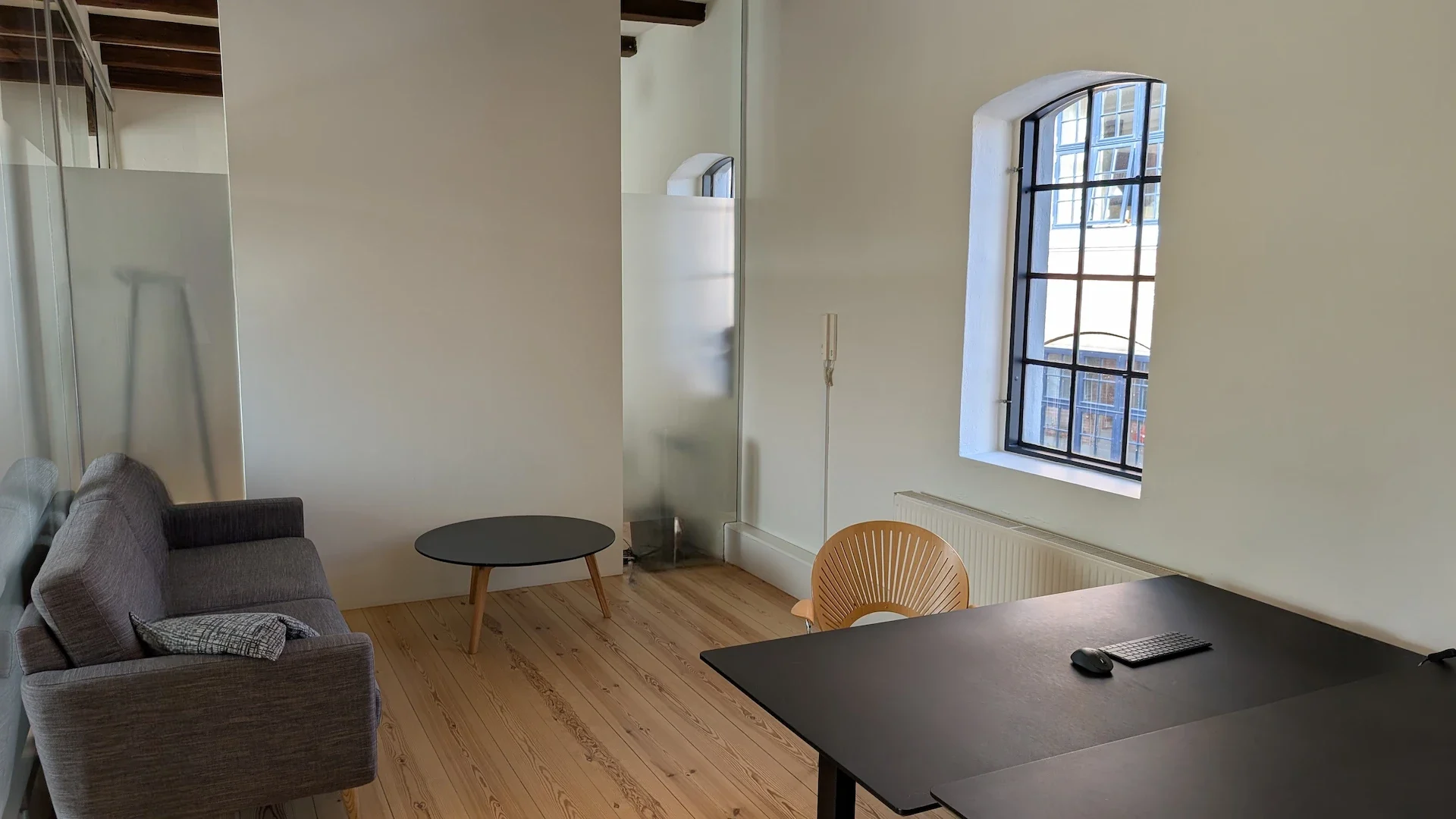 Alle lokaler er lyse og med charmerende gennemgående spær og glasvægge.